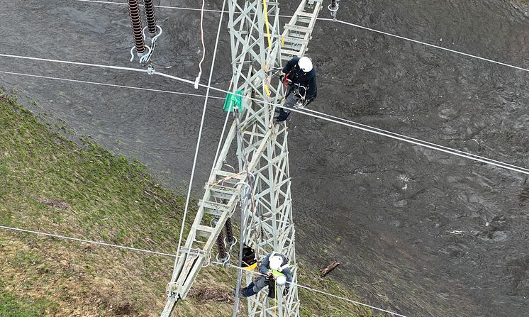 Freileitungsmonteure installieren den neuen KI-Sensor an einer Freileitung in Weiden