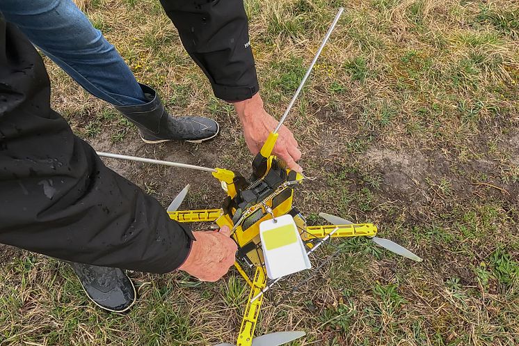 Mit einer Flugdrohne hat die Bayernwerk Netz GmbH rund 70 spezielle Vogelschutzmarker auf einem Abschnitt einer Hochspannungsleitung über der Isar bei Eching angebracht.
