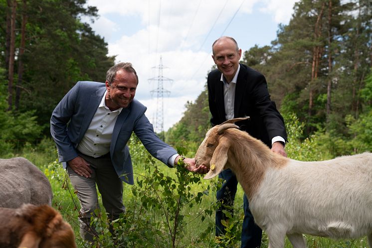 Umweltminister Thorsten Glauber (l.) und Bayernwerk-Vorstandsvorsitzender Dr. Egon Westphal streicheln am Mittwoch eine Ziege in Bamberg. Die Vierbeiner kümmern sich beim ökologischen Trassenmanagement darum, dass die Hochspannungsleitung frei bleibt und ein Biotopverbund entstehen kann.