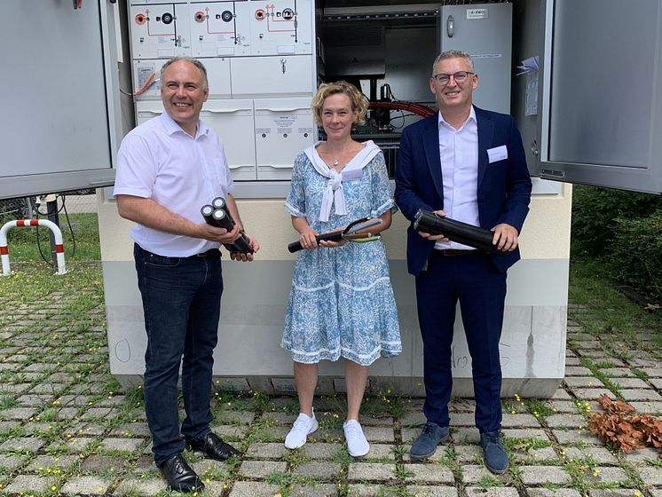 Die Bayernwerk Netz GmbH hat am Montag, 17.07.2023 den Netzausbau in der Region Kolbermoor vorgestellt. Von links: Leiter Betrieb Umspannwerke & Schaltstationen Thomas Kotarski, Leiterin Kommunalmanagement Oberbayern Silke Mall, Leiter Kundencenter Kolbermoor Gazmend Kryeziu.