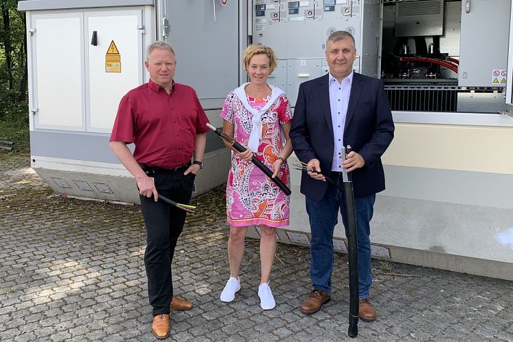 Die Bayernwerk Netz hat am Donnerstag, 22.06.2023 den Netzausbau in der Region Unterschleißheim vorgestellt. Von links: Leiter Grundsatz- & Genehmigungsmanagement Dr. Peter Volkholz, Leiterin Kommunalmanagement Oberbayern Silke Mall, Leiter Kundencenter Unterschleißheim Giovanni D'Annibale.