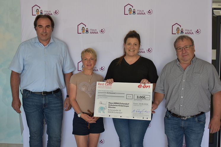 Spendenübergabe im Haus Anna (v.li.): Bayernwerk-Betriebsrat Martin Weinfurtner, Maren Römhild (Bayernwerk), Alexandra Santl (Stiftung Ambulantes Kinderhospiz München) und Martin Aust (Bayernwerk).