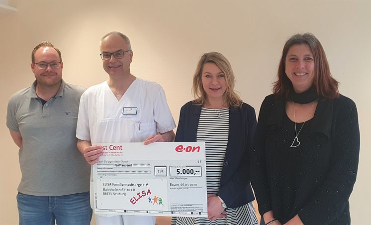 Wichtige Hilfe in schweren Zeiten: Sabine Voit, stellvertretende Betriebsratsvorsitzende der Region Oberbayern des Bayernwerks (rechts), und ihr Kollege Florian Hültl, Servicetechniker am Kundencenter Penzberg (links), überreichten am 5. März 2020 die Spende in Höhe von 5.000 Euro an Nadine Dier, ELISA-Geschäftsführerin (3vl.), und Dr. Florian Wild, Vorsitzender und Oberarzt der Kinderklinik St. Elisabeth (2.vl.). Die Mitarbeiter und ehrenamtlichen Helfer des Vereins ELISA in Neuburg an der Donau helfen Familien mit schwerst-, chronisch- und krebskranken Kindern.