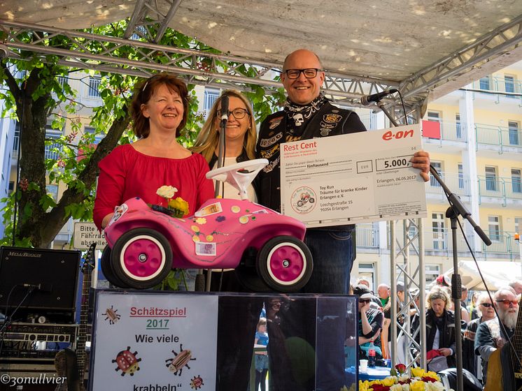 Der stellvertretende oberfränkische Betriebsratsvorsitzende des Bayernwerks, Gerhard Lehner, und Anja Görke, Leiterin des Personalbereichs Oberfranken, übergaben den Spendenscheck an die Vorsitzende des Toy Run Erlangen e. V., Marion Müller (links).
