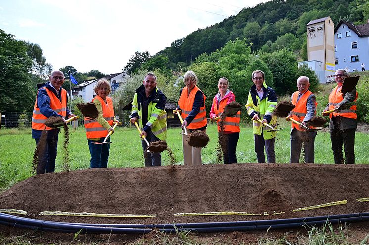 Spatenstich für den zweiten Baumabschnitt des Netzausbaus bei Heimbuchenthal mit Günter Jira (Kommunalmanagement Franken, Bayernwerk Netz GmbH), Waltraud Amrhein (Bürgermeisterin Dammbach), Sebastian Schreck (Leiter Kundencenter Marktheidenfeld sowie Leiter Bau- & Betriebsmanagement Franken, Bayernwerk Netz GmbH), Stephanie Fuchs (Bürgermeisterin Mespelbrunn), Judith Gerlach (Bayerische Staatsministerin für Digitales), Dr. Andreas Kießling (Leiter Vorstandsbüro & Politik, Bayernwerk AG), Andreas Zenglein (Stellv. Landrat Landkreis Aschaffenburg) und Rüdiger Stenger (Bürgermeister Heimbuchenthal)