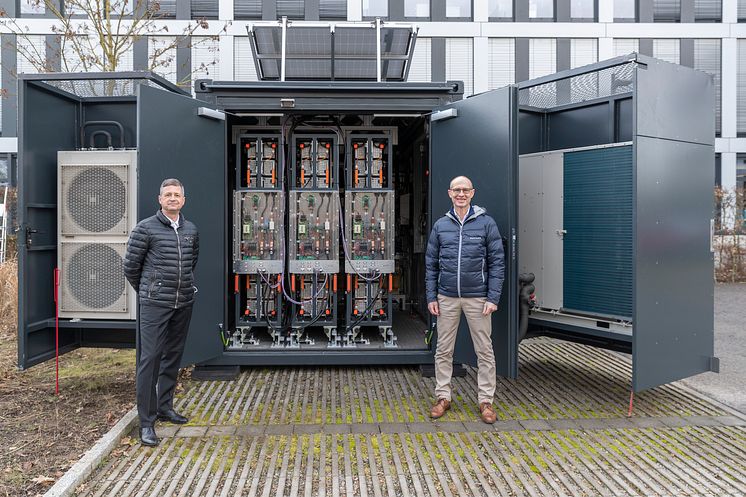 Im Inneren besteht der Container aus Second-Life-Lithium-Ionen-Modulen. Dafür wurden die Akkus aus fünf Audi e-trons neu aufbereitet. Egon Schubert (links), Geschäftsführer innofas GmbH, und Dr. Egon Westphal (rechts), Technikvorstand des Bayernwerks, stellen den neuen Stromspeicher vor der Regensburger Unternehmensleitung des Bayernwerks vor.