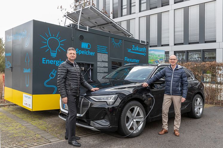 von links: Egon Schubert, Geschäftsführer innofas GmbH, und Dr. Egon Westphal, Technikvorstand des Bayernwerks, stellen den neuen Stromspeicher vor der Regensburger Unternehmensleitung des Bayernwerks vor.