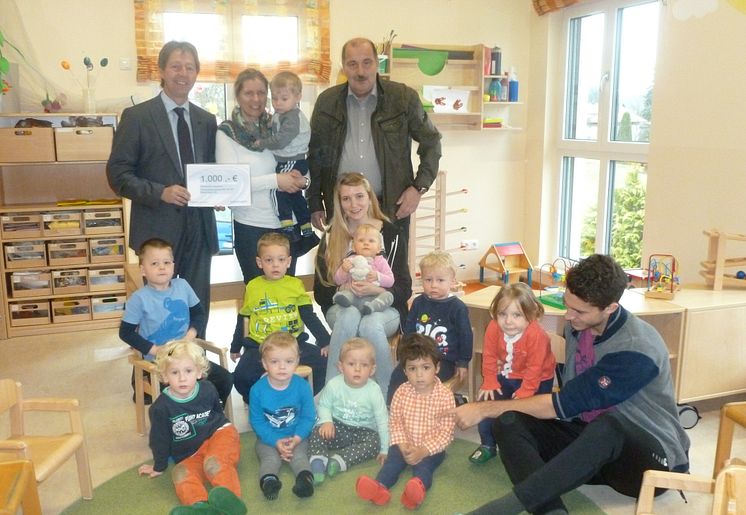 Mit einer Spende unterstützt das Bayernwerk den Kindergarten St. Jakob in Haselbach. Johann Seebauer, Kommunalbetreuer des Bayernwerks (stehend links), übergab die Spende in Höhe von 1.000 Euro, im Beisein von Bürgermeister Hans Sykora (stehend rechts) an Kindergartenleiterin Silke Lehmann (Mitte). Das Geld wird für die Anschaffung von pädagogischem Kreativspielzeug verwendet.