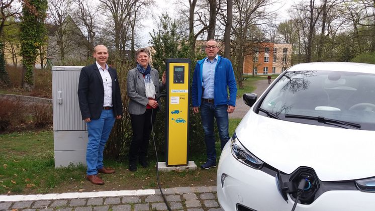 Bürgermeisterin Maria Steger, Thomas Grundstein vom Hochbauamt (rechts) und Bayernwerk-Kommunalbetreuer Daniel Pangerl (links) nahmen die neuen Stromtankstellen heute offiziell in Betrieb.