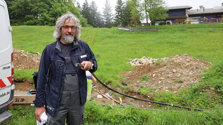 In Samerberg hat die Bayernwerk Netz vergangene Woche Transformatorenstationen im Berggebiet des Hochries erneuert. Servicetechniker Richard Nachbar zeigt das eingesetzte Erdkabel, mit dem die Transformatorenstation angeschlossen wird.