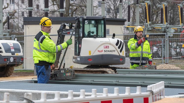 Trafolieferung im Umspannwerk Lilienthalstraße - Nur mit Muskelkraft ziehen die Fachleute den 60 Tonnen schweren Trafo auf das Fundament
