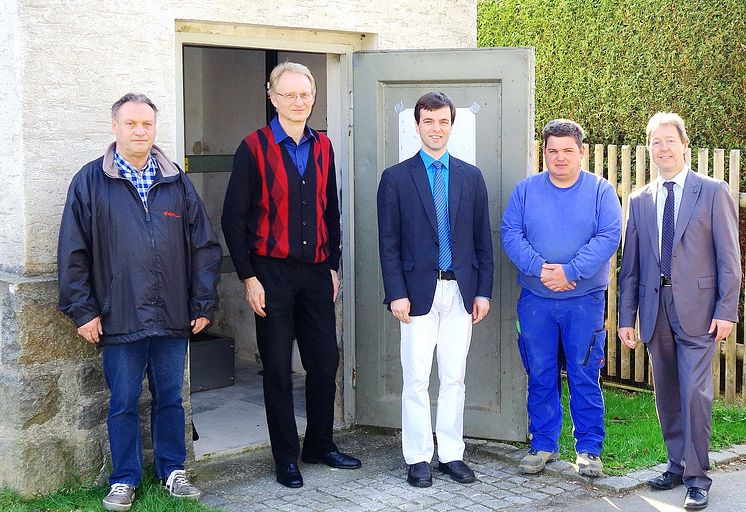 Projektverantwortlicher Franz Huttner und Netzbauleiter Rudolf Wittmann vom zuständigen Bayernwerk-Netzcenter Schwandorf informierten Bürgermeister Daniel Paul über die Arbeiten. Mit dabei Mario Mischok, Mitarbeiter der Firma Brandl, und Johann Seebauer, Kommunalbetreuer beim Bayernwerk.