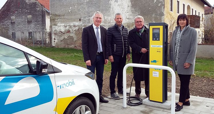 Ampfings Zweite Bürgermeisterin Gabriele Herian, Erster Bürgermeister Ottmar Wimmer und Thomas Nicklbauer (von rechts) vom Bauamt stellten gemeinsam mit Kommunalbetreuer Armin Irlbeck (links) die neue Ladesäule in der Schweppermannstraße vor.