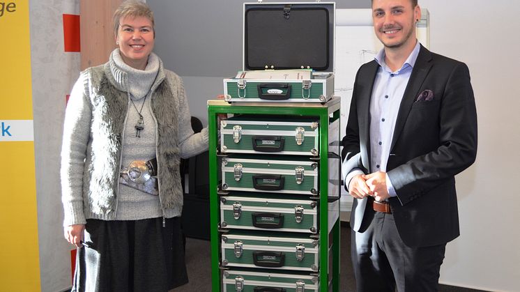 Birgit Zwicknagel vom Verein NH-HH-Recycling übergab den Lernzirkelwagen an Tobias Marschner, den Bayernwerk-Ausbildungsleiter in Oberbayern.