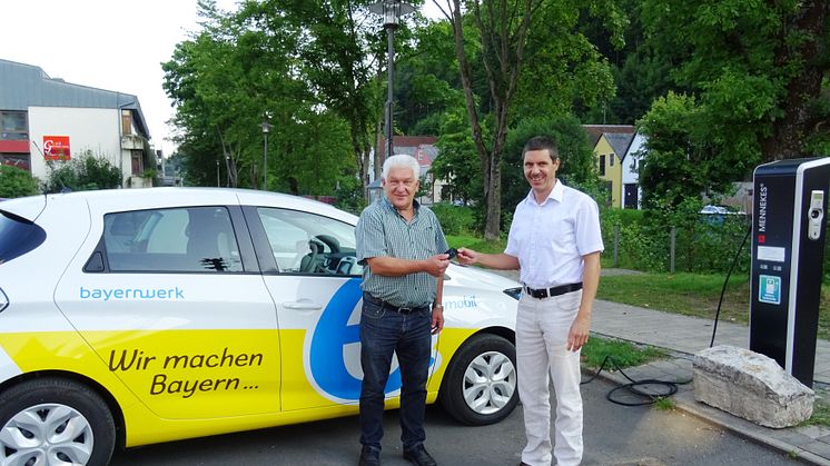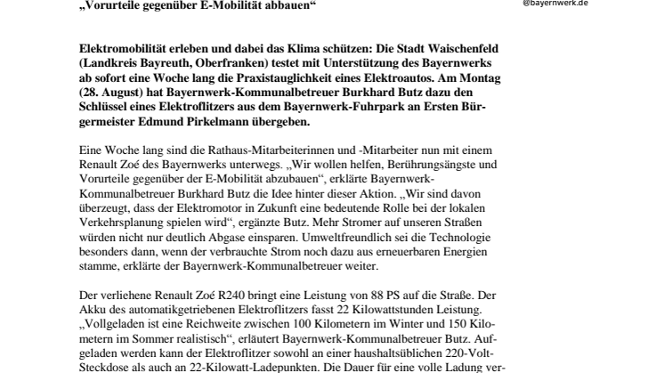 Elektromobilität erleben und dabei das Klima schützen: Die Stadt Waischenfeld (Landkreis Bayreuth, Oberfranken) testet mit Unterstützung des Bayernwerks ab sofort eine Woche lang die Praxistauglichkeit eines Elektroautos. Am Montag (28. August) hat Bayernwerk-Kommunalbetreuer Burkhard Butz dazu den Schlüssel eines Elektroflitzers aus dem Bayernwerk-Fuhrpark an Ersten Bürgermeister Edmund Pirkelmann übergeben.