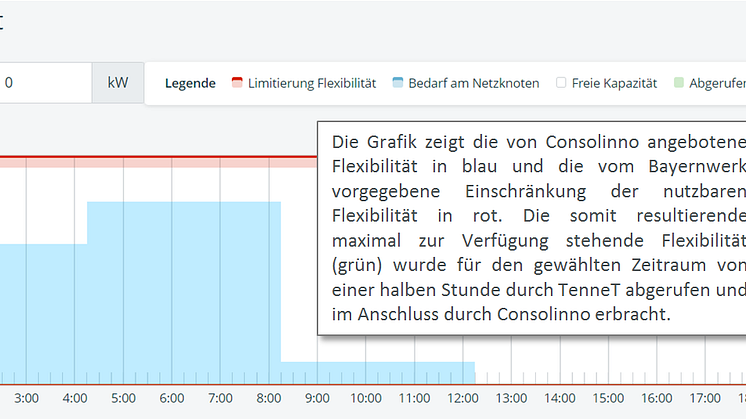 Bei dem Testabruf wurde auf Anforderung von TenneT die Einspeisung einer von Consolinno gesteuerten KWK-Anlage, die am Nieder- und Mittelspannungsnetz des Bayernwerks angebunden ist, erhöht, so dass sie dem Netz in Engpasssituationen den zur Stabilisierung notwendigen Strom zur Verfügung stellen konnte. Neu ist, dass die Anlage durch Technologie von Consolinno selbständig mittels künstlicher Intelligenz ihr Flexibilitätspotenzial feststellt. Das Flexibilitätspotenzial der einzelnen Anlagen kann dann mittels Schwarmintelligenz weiter aggregiert werden oder direkt kontinuierlich in einer Zeit von 36 Stunden bis zu 20 Minuten vor der Erbringung dem Netzbetreiber mitgeteilt werden. Die Anlagen befinden sich dabei in der normalen Vermarktung und Betriebsweise und melden zusätzlich freie Flexibilitätsmengen in Form von Fahrplänen, die der Netzbetreiber dann aktiv in die Planung einbinden kann (siehe Grafik Seite 2).