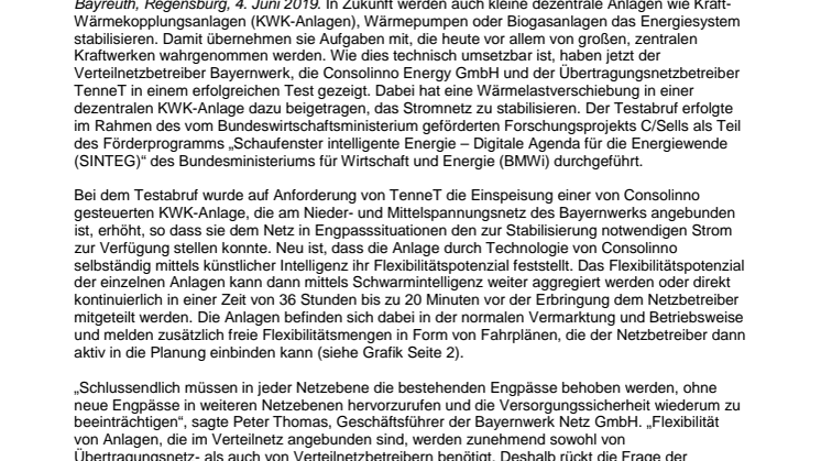 Bayreuth, Regensburg, 4. Juni 2019. In Zukunft werden auch kleine dezentrale Anlagen wie Kraft-Wärmekopplungsanlagen (KWK-Anlagen), Wärmepumpen oder Biogasanlagen das Energiesystem stabilisieren. Damit übernehmen sie Aufgaben mit, die heute vor allem von großen, zentralen Kraftwerken wahrgenommen werden. Wie dies technisch umsetzbar ist, haben jetzt der Verteilnetzbetreiber Bayernwerk, die Consolinno Energy GmbH und der Übertragungsnetzbetreiber TenneT in einem erfolgreichen Test gezeigt. Dabei hat eine Wärmelastverschiebung in einer dezentralen KWK-Anlage dazu beigetragen, das Stromnetz zu stabilisieren. Der Testabruf erfolgte im Rahmen des vom Bundeswirtschaftsministerium geförderten Forschungsprojekts C/Sells als Teil des Förderprogramms „Schaufenster intelligente Energie – Digitale Agenda für die Energiewende (SINTEG)“ des Bundesministeriums für Wirtschaft und Energie (BMWi) durchgeführt.