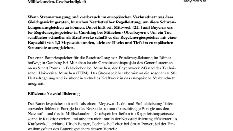 Wenn Stromerzeugung und -verbrauch im europäischen Verbundnetz aus dem Gleichgewicht geraten, brauchen Netzbetreiber Regelleistung, um diese Schwankungen ausgleichen zu können. Dabei hilft seit Mittwoch (21. Juni) Bayerns erster Regelenergiespeicher in Garching bei München (Oberbayern). Um ein Tausendfaches schneller als Kraftwerke schafft es der Regelenergiespeicher mit einer Kapazität von 1,2 Megawattstunden, kleinere Hochs und Tiefs im europäischen Stromnetz auszugleichen.