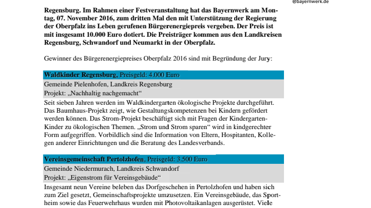Regensburg. Im Rahmen einer Festveranstaltung hat das Bayernwerk am Montag, 7. November 2016, zum dritten Mal den mit Unterstützung der Regierung der Oberpfalz ins Leben gerufenen Bürgerenergiepreis vergeben. Der Preis ist mit insgesamt 10.000 Euro dotiert. Die Preisträger kommen aus den Landkreisen Regensburg, Schwandorf und Neumarkt in der Oberpfalz.