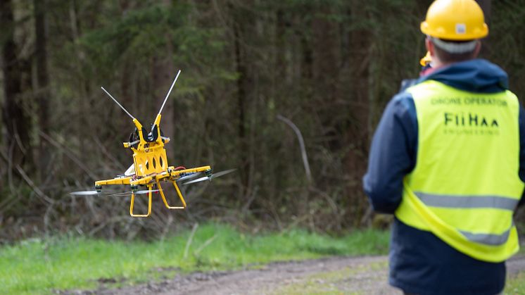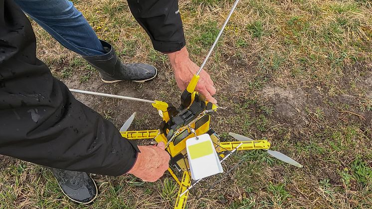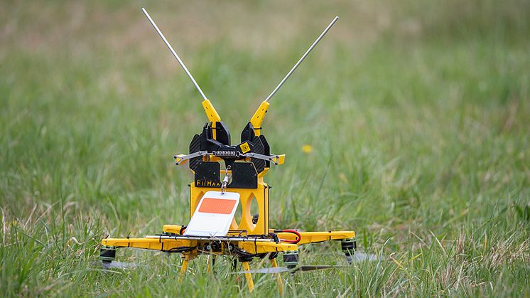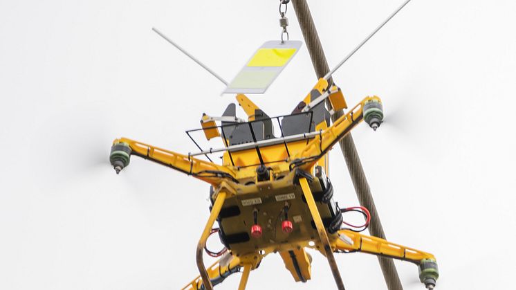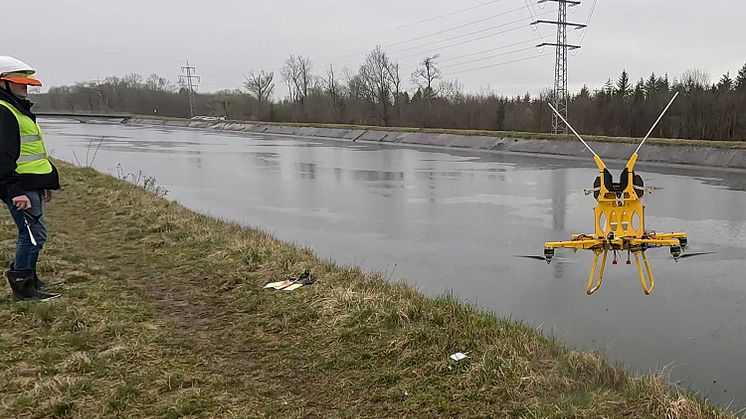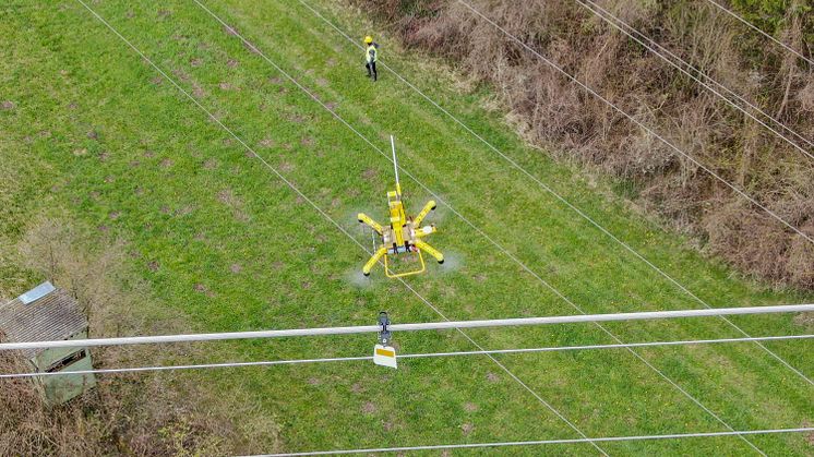 „Zum Einsatz kommt eine speziell für den Zweck gebaute Quadrokopter-Drohne“, erläutert Christian Poppe. „Sie ist vergleichsweise klein und wiegt weniger als zwei Kilo.“ Die Klammern mit einer starken Spiralfeder werden zunächst aufgespannt und an der Drohne befestigt. Durch einen geringen Impuls schnappt die Klammer zu und umgreift die Leitung, sobald sie das Leiterseil berührt. Drei geschulte Mitarbeiter waren bei der Montage für die Partnerfirma im Einsatz. Eine Person steuerte die Drohne, eine andere beobachtete die Umgebung und eine Dritte befestigte die neuen Marker an der Drohne.