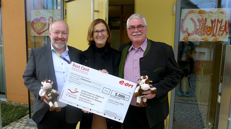 Bad Grönenbach. Sie helfen in den schwersten Stunden. Die Mitarbeiter und Helfer im Kinderhospiz St. Nikolaus in Bad Grönenbach begleiten unheilbar erkrankte Kinder und deren Familien in der verbleibenden gemeinsamen Zeit. Um das Kinderhospiz bei diesem aufopferungsvollen Dienst zu unterstützen, hat das Bayernwerk eine Spende in Höhe von 5.000.- Euro überreicht. Die Spende stammt aus dem Mitarbeiter-Hilfsfond „RestCent“ des E.ON-Konzerns. Seit 2003 verzichtet ein Großteil der E.ON-Mitarbeiterinnen und -Mitarbeiter am Monatsende dauerhaft und freiwillig auf die Auszahlung ihrer Netto-Cent-Beträge. Der dadurch gespendete Beitrag wird durch den E.ON-Konzern verdoppelt.