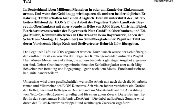 In Deutschland leben Millionen Menschen in oder am Rande der Einkommensarmut. Und wenn das Geld knapp wird, sparen die meisten bei der täglichen Ernährung. Tafeln schaffen hier einen Ausgleich. Deshalb unterstützt der „Mitarbeiter-Hilfsfond der E.ON SE“ die Arbeit der Pegnitzer Tafel (Landkreis Bayreuth, Oberfranken) mit einer Spende in Höhe von 5.000 Euro. Christian Bickel, Betriebsratsvorsitzender der Bayernwerk Netz GmbH in Oberfranken, und Edgar Müller, Kommunalbetreuer in Oberfranken beim Bayernwerk, haben den Scheck am Montag (18. September) im Schloßbergladen der Pegnitzer Tafel an deren Vorsitzende Helga Koch und Stellvertreter Heinrich Löw übergeben.