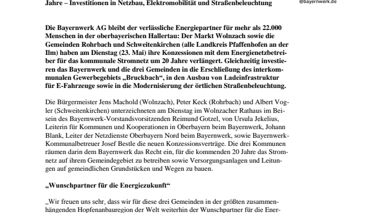 Die Bayernwerk AG bleibt der verlässliche Energiepartner für mehr als 22.000 Menschen in der oberbayerischen Hallertau: Der Markt Wolnzach sowie die Gemeinden Rohrbach und Schweitenkirchen (alle Landkreis Pfaffenhofen an der Ilm) haben am Dienstag (23. Mai) ihre Konzessionen mit dem Energienetzbetreiber für das kommunale Stromnetz um 20 Jahre verlängert. Gleichzeitig investieren das Bayernwerk und die drei Gemeinden in die Erschließung des interkommunalen Gewerbegebiets „Bruckbach“, in den Ausbau von Ladeinfrastruktur für E-Fahrzeuge sowie in die Modernisierung der örtlichen Straßenbeleuchtung.