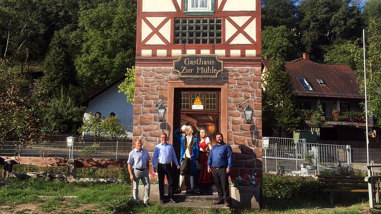 Die Trafostation wurde zum Gasthaus mit Sandsteinmauern und Fachwerk verwandelt und erzählt nun eine Räuberszene aus damaliger Zeit. Ein betrunkener Gast wird von einer hübschen Räuberin aus dem Gastraum gelockt. Vor dem Gebäude, hinter einem Bierfass lauern bereits die Räuberkomplizen, um den nichtsahnenden Kaufmann auszurauben. „Das Motiv erinnert an die Zeiten wo Spessarträuber in unserer Region ihr Unwesen trieben und greift auch unser Tourismusthema Räuberland auf. Mit einem attraktiven Angebot bieten wir unseren Gästen erlebnisreiche Tage im Räuberland mit vielen Veranstaltungen im Herzen des Spessarts“, sagte Bürgermeister Michael Schüßler beim Ortstermin am neu gestalteten Trafohaus.
