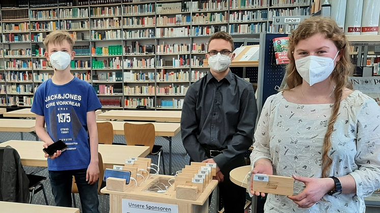 Eine solarenergiebetriebene Lademöglichkeit für Powerbanks in der Schulbibliothek haben Zehntklässler des Balthasar-Neumann-Gymnasiums in Marktheidenfeld realisiert. Die Powerbank-Lademöglichkeit haben sie im Rahmen eines Schulprojekts gemeinsam mit ihrem Lehrer entwickelt, geplant und gebaut. Zudem haben sie das Finanzierungskonzept erstellt und das erforderliche Geld über Spenden und Pfandaktionen selbst organisiert. Zu den Herausforderungen zählten die Installation eines Solarmoduls auf dem Flachdach der Schule und der Einbau eines Wechselrichters. Jetzt steht ein Holzschränkchen in der Schulbibliothek, in dem eine große Batterie den Sonnenstrom vom Dach speichert und aus dem zehn Kabel mit USB-Anschlüssen führen, die das Aufladen der Powerbanks ermöglichen. Diese können in der Bibliothek von den Jugendlichen für jeweils eine Woche ausgeliehen werden. Die Schule erhält ein Preisgeld von 3.000 Euro.