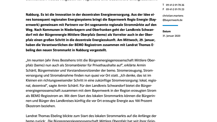 Bereits zum Start stellen zwei große regenerative Erzeugungsanlagen aus dem Landkreis Schwandorf bei BEMO Regiostrom ihren erzeugten Strom der Region zur Verfügung. Eine Beteiligung weiterer Energieerzeuger aus dem Landkreis Schwandorf, idealerweise mit einer Leistung größer als 100 kW, ist weiterhin möglich. Mehr im Internet unter www.bayernwerk-regio-energie.de/bemo
