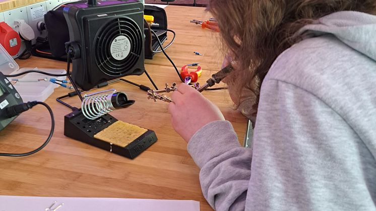 In der Ausbildungswerkstatt konnten die Schülerinnen unter Anleitung eine kleine Drahtfigur basteln: Mit Lötkolben, verschiedenen Werkzeugen und einem 3D-Drucker konnten sie ihr Souvenir eigenhändig zusammenbauen. „Es ist uns wichtig, den Schülerinnen vielfältige Einblicke zu vermitteln. Gerade in der Werkstatt können sie konkret ausprobieren, ob das handwerkliche Arbeiten etwas für sie sein könnte“, erklärt Kathrin Filp.