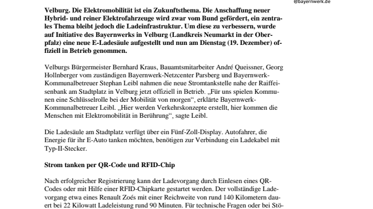 Velburg. Die Elektromobilität ist ein Zukunftsthema. Die Anschaffung neuer Hybrid- und reiner Elektrofahrzeuge wird zwar vom Bund gefördert, ein zentrales Thema bleibt jedoch die Ladeinfrastruktur. Um diese zu verbessern, wurde auf Initiative des Bayernwerks in Velburg (Landkreis Neumarkt in der Oberpfalz) eine neue E-Ladesäule aufgestellt und nun am Dienstag (19. Dezember) offiziell in Betrieb genommen.