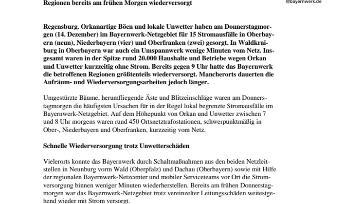 Regensburg. Orkanartige Böen und lokale Unwetter haben am Donnerstagmorgen (14. Dezember) im Bayernwerk-Netzgebiet für 15 Stromausfälle in Oberbayern (neun), Niederbayern (vier) und Oberfranken (zwei) gesorgt. In Waldkraiburg in Oberbayern war auch ein Umspannwerk wenige Minuten vom Netz. Insgesamt waren in der Spitze rund 20.000 Haushalte und Betriebe wegen Orkan und Unwetter kurzzeitig ohne Strom. Bereits gegen 9 Uhr hatte das Bayernwerk die betroffenen Regionen größtenteils wiederversorgt. Mancherorts dauerten die Aufräum- und Wiederversorgungsarbeiten jedoch länger.