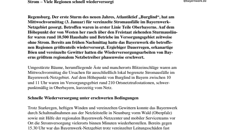 Regensburg. Der erste Sturm des neuen Jahres, Atlantiktief „Burglind“, hat am Mittwochvormittag (3. Januar) für vereinzelte Stromausfälle im Bayernwerk-Netzgebiet gesorgt. Betroffen waren in erster Linie Teile Oberbayerns. Auf dem Höhepunkt der von Westen her rasch über den Freistaat ziehenden Sturmausläufer waren rund 10.500 Haushalte und Betriebe im Versorgungsgebiet zeitweise ohne Strom. Bereits am frühen Nachmittag hatte das Bayernwerk die betroffenen Regionen größtenteils wiederversorgt. Ergiebiger Dauerregen, orkanartige Böen und vereinzelte Gewitter hatten die Wiederversorgungsarbeiten von Bayerns größtem regionalem Netzbetreiber phasenweise erschwert.