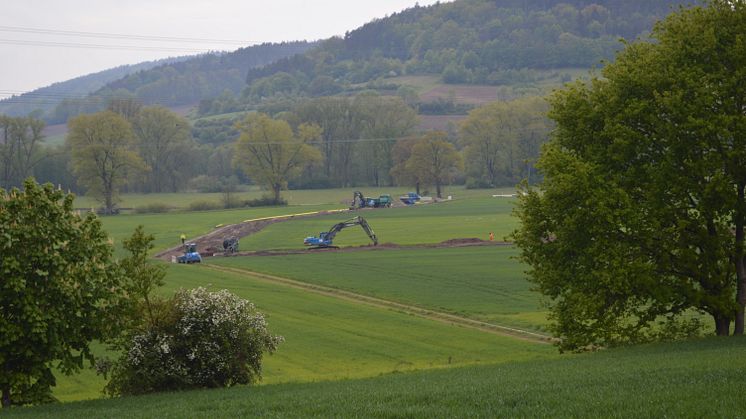 Jede Leitung hat auch irgendwann ihr Lebensende erreicht. Im Ortsteil Beikheim in Schneckenlohe ist dies der Fall. Hier wird seit einigen Wochen eine etwa 40 Jahre alte Gasleitung durch eine neue ersetzt. Auf einer eigens hierfür angelegten Trasse, die fast drei Kilometer lang ist und den Ort nur tangiert, anstatt ihn zu kreuzen, wird zukünftig eine neue Gashochdruckleitung führen. Anfang April begannen die Mitarbeiter einer beauftragten Baufirma mit den Bodenarbeiten. In circa einem Meter Tiefe wird eine so genannte „Gashochdruckleitung DP 16“ verlegt, die dann weiterhin viele tausend Haushalte in Oberfranken sicher mit Erdgas versorgen wird. Durch das neue 20 Zentimeter dicke Stahlrohr, das zusätzlich mit einer Kunststoffschicht ummantelt ist, werden dann bis zu 40 Millionen Kubikmeter Gas pro Jahr transportiert. Zum Abschluss der Arbeiten wird die alte, durch den Ort führende Gasleitung aus dem Betrieb genommen, vollständig gespült und schließlich gastechnisch versiegelt.